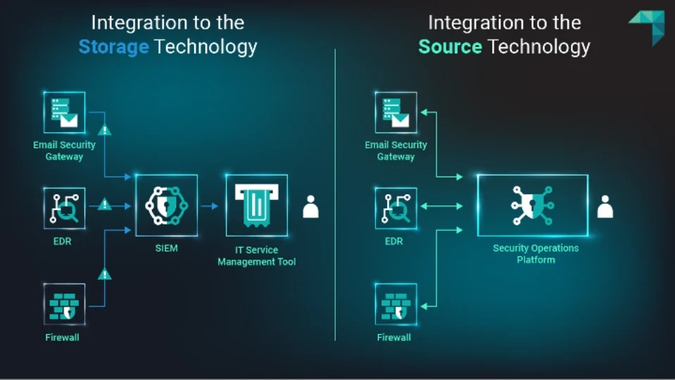 The image below compares a traditional detection workflow for an allowed-malicious-email alert, which is integrated with a storage technology, to a workflow that integrates directly with a source technology.