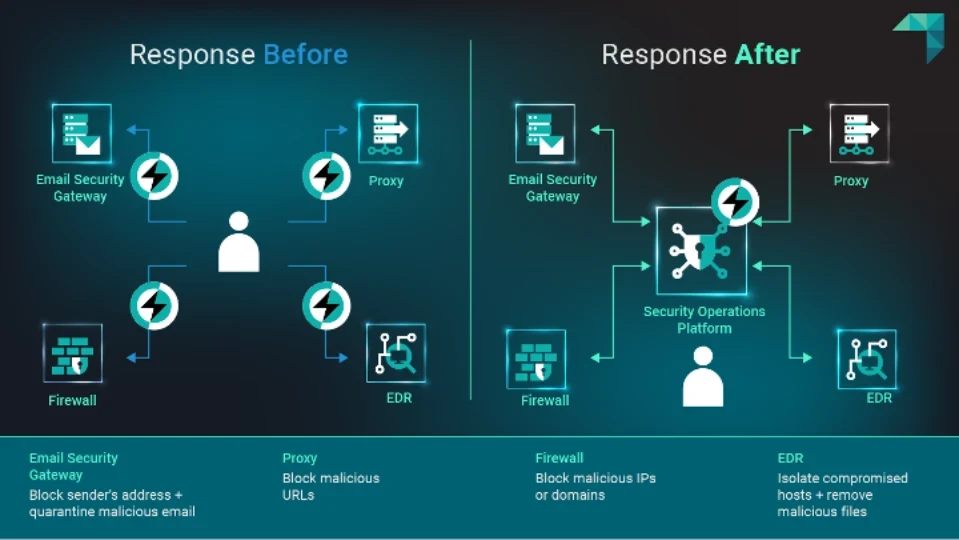 In contrast, integrating these tools together provides centralized security controls that allow all response actions to be executed from a single location. This integrated approach ensures faster and more efficient threat investigations, ultimately reducing MTTR.